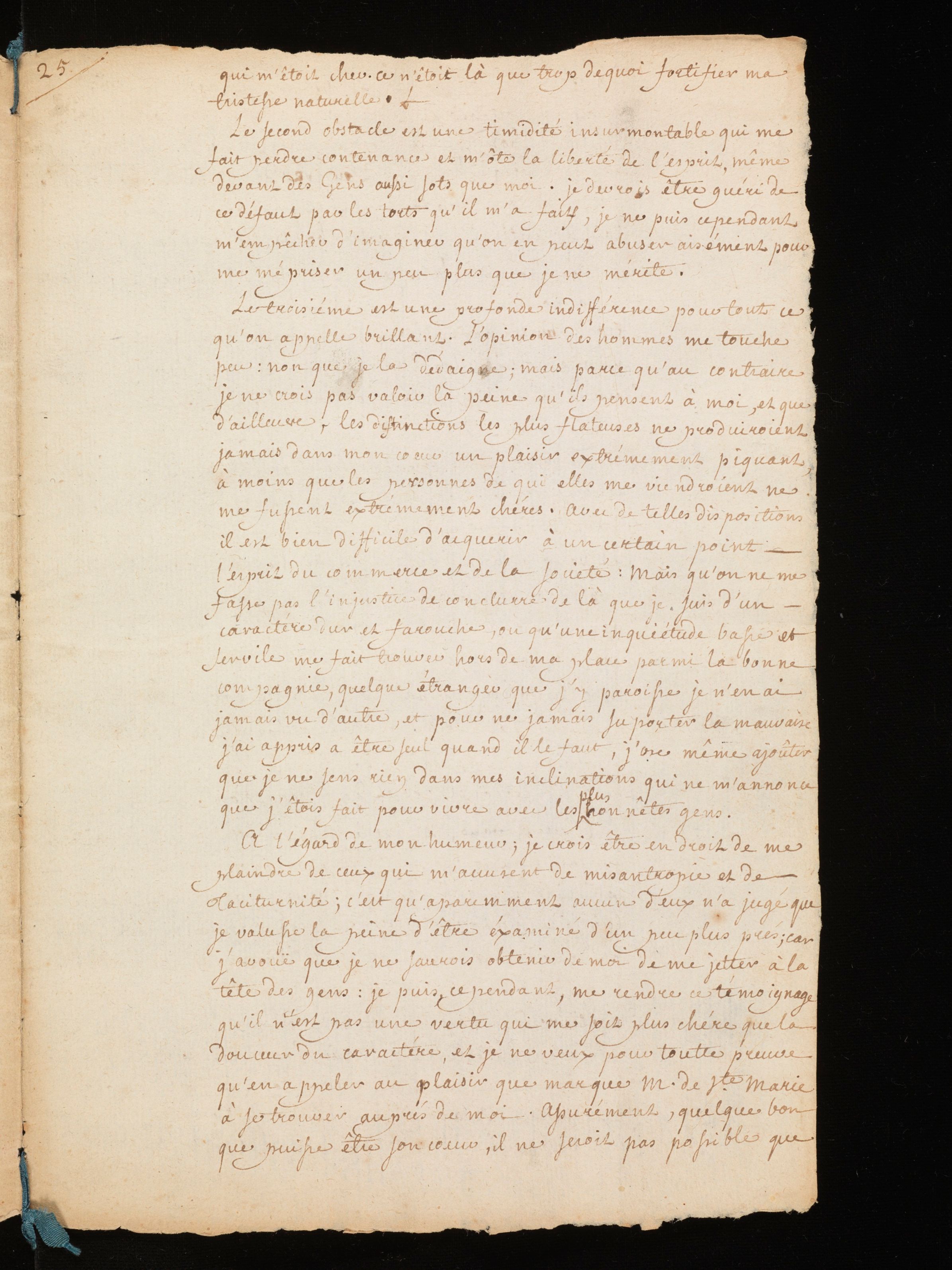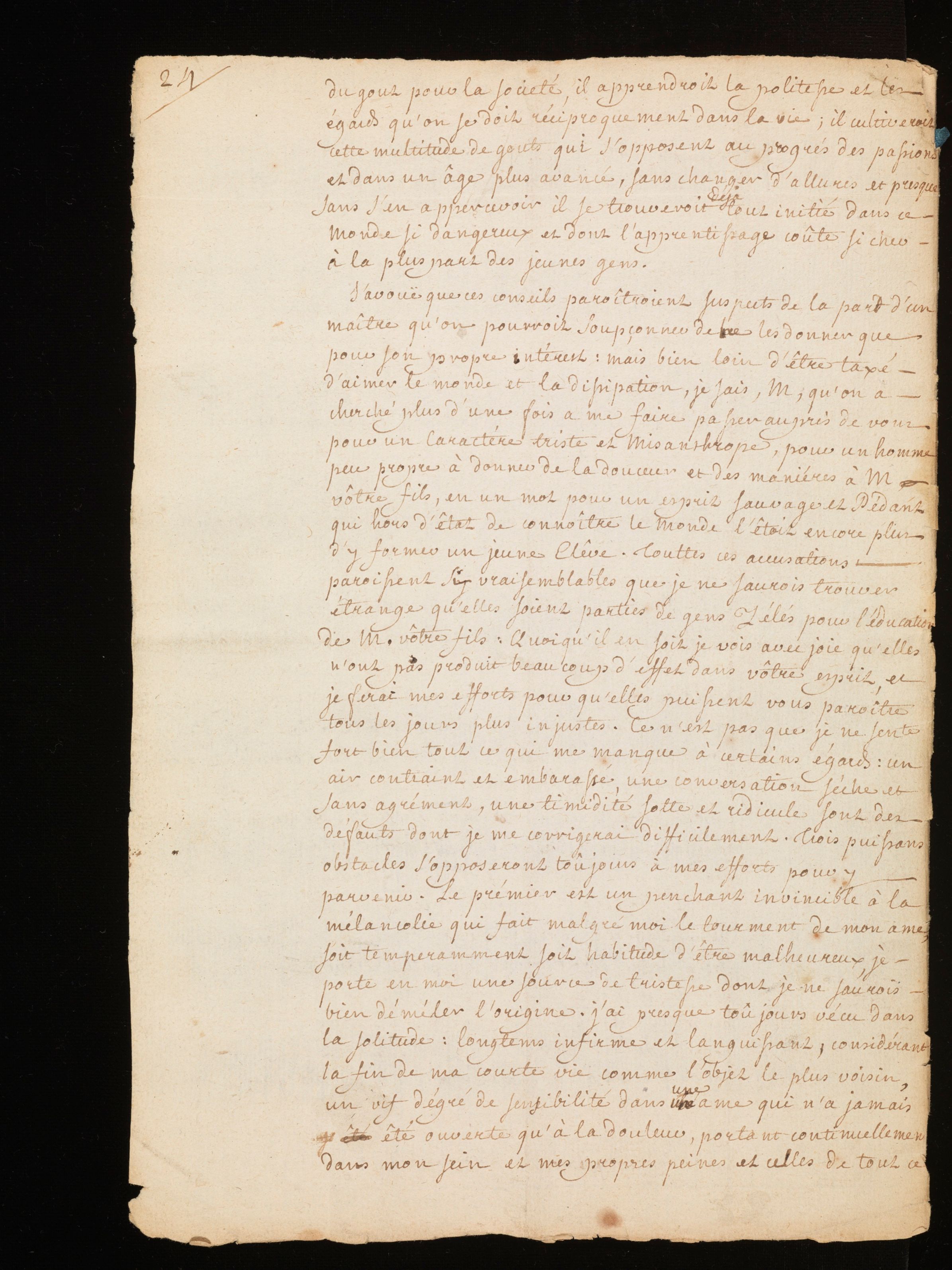 Manuscrit autographe (copie d’auteur ), avec corrections autographes et allographes. Rousseau indique à M. de Mably les principes d’éducation qu’il compte appliquer auprès de ses fils. Le projet est composé selon un ordre rigoureux. Il s’agit d’abord de s’attacher aux capacités propres à l’élève afin de développer une méthode d’enseignement qui lui soit adéquate. Il faut aussi pouvoir délimiter de manière précise l’autorité du précepteur ainsi que celle du père, cette-dernière devant être soumise préalablement à l’avis du précepteur. La question de l’autorité est également l’occasion d’un détour sur le caractère difficile de Sainte-Marie, le fils aîné, qui s’annonce difficile à éduquer.