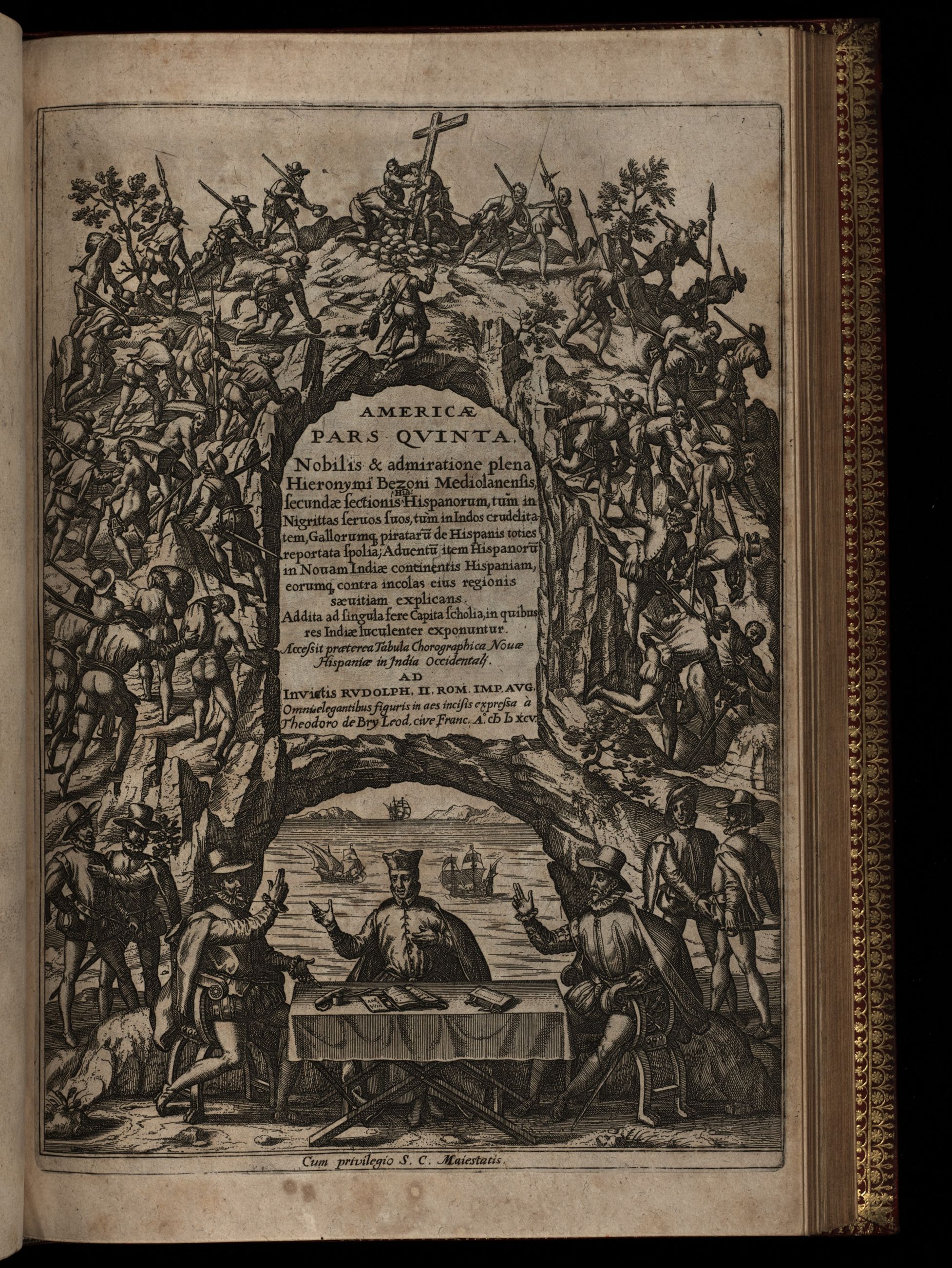 Americae pars quinta. Nobilis & admiratione plena Hieronymi Bezoni Mediolanensis, secundae sectionis Hispanorum, tum in Nigrittas seruos suos, tum in Indos crudelitatem, Gallorumq pirataru de Hispanis toties reportata spolia : aduentu item Hispanoru in Nouam Indiae cotinentis Hispaniam, eorumq contra incolas eius regionis saeuitiam explicans : addita ad singula fere capita scholia, in quibus res Indiae luculenter exponuntur : accessit praeterea tabula chorographica nouae Hispaniae in India Occidentali.