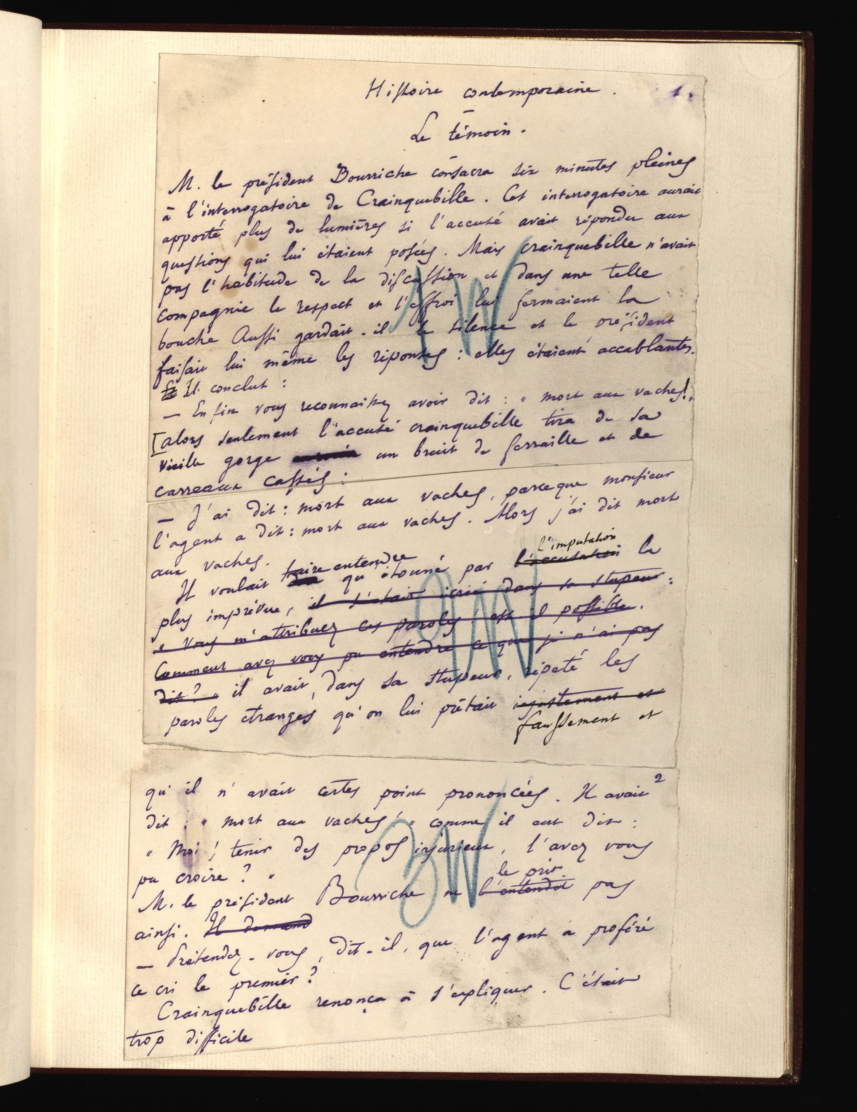 Manuscrit autographe signé des chapitres I - III avec premières premières épreuves corrigées par l'auteur. Premier état connu du texte: titre inital Histoire contemporaine - Jérôme Crainquebille corrigé en Histoire contemporaine - L'affaire Crainquebille.
