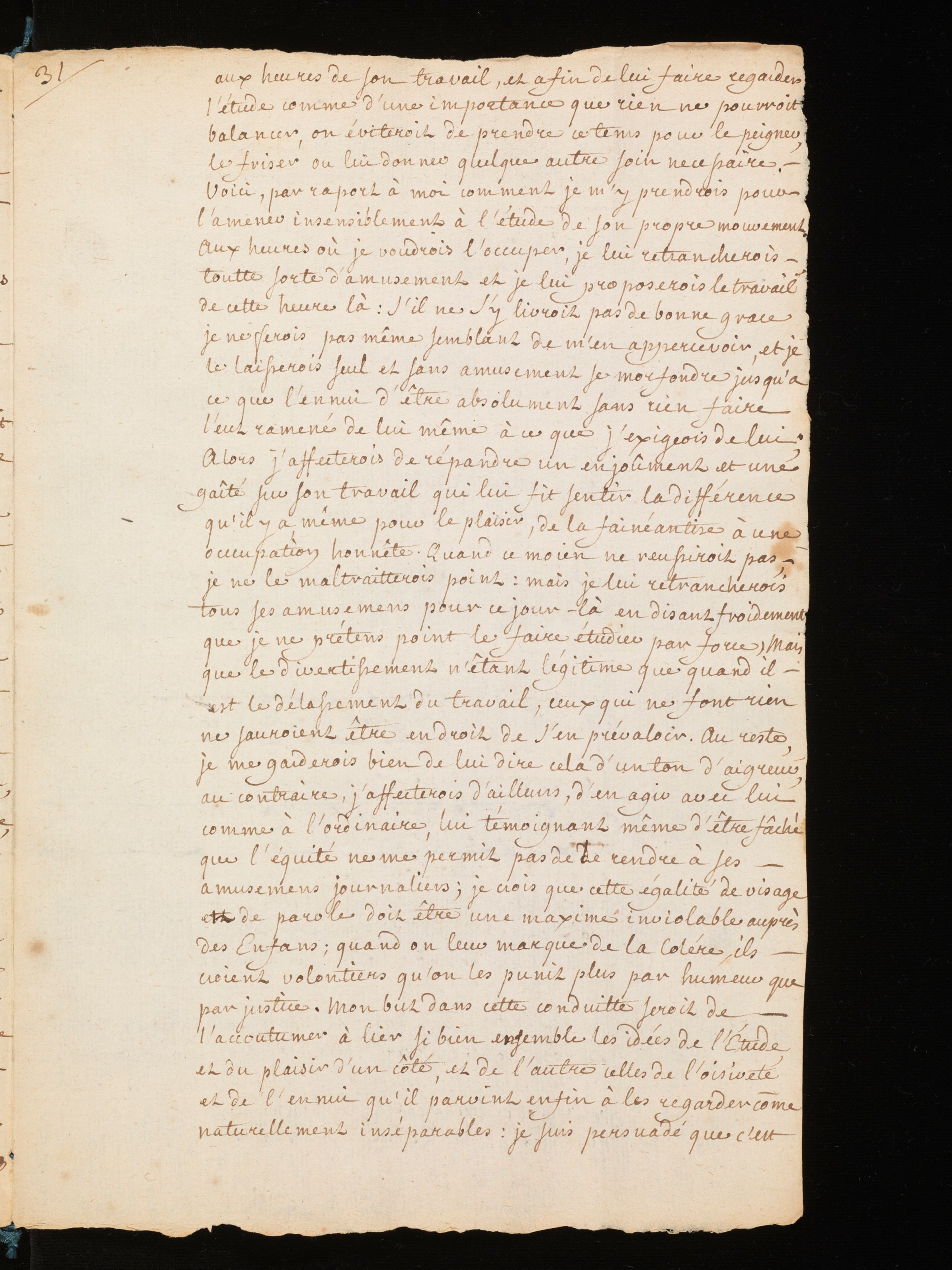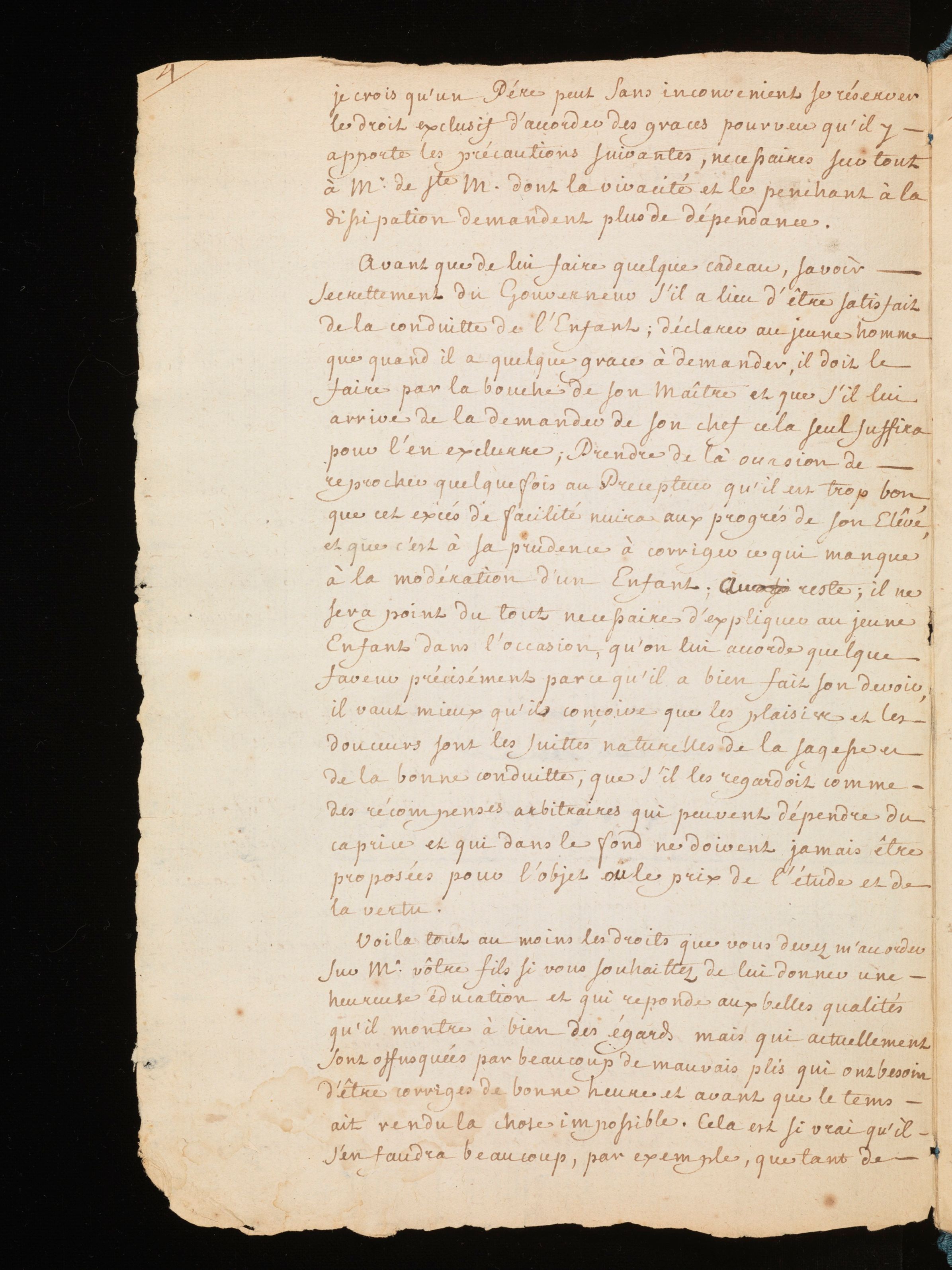 Manuscrit autographe (copie d’auteur ), avec corrections autographes et allographes. Rousseau indique à M. de Mably les principes d’éducation qu’il compte appliquer auprès de ses fils. Le projet est composé selon un ordre rigoureux. Il s’agit d’abord de s’attacher aux capacités propres à l’élève afin de développer une méthode d’enseignement qui lui soit adéquate. Il faut aussi pouvoir délimiter de manière précise l’autorité du précepteur ainsi que celle du père, cette-dernière devant être soumise préalablement à l’avis du précepteur. La question de l’autorité est également l’occasion d’un détour sur le caractère difficile de Sainte-Marie, le fils aîné, qui s’annonce difficile à éduquer.
