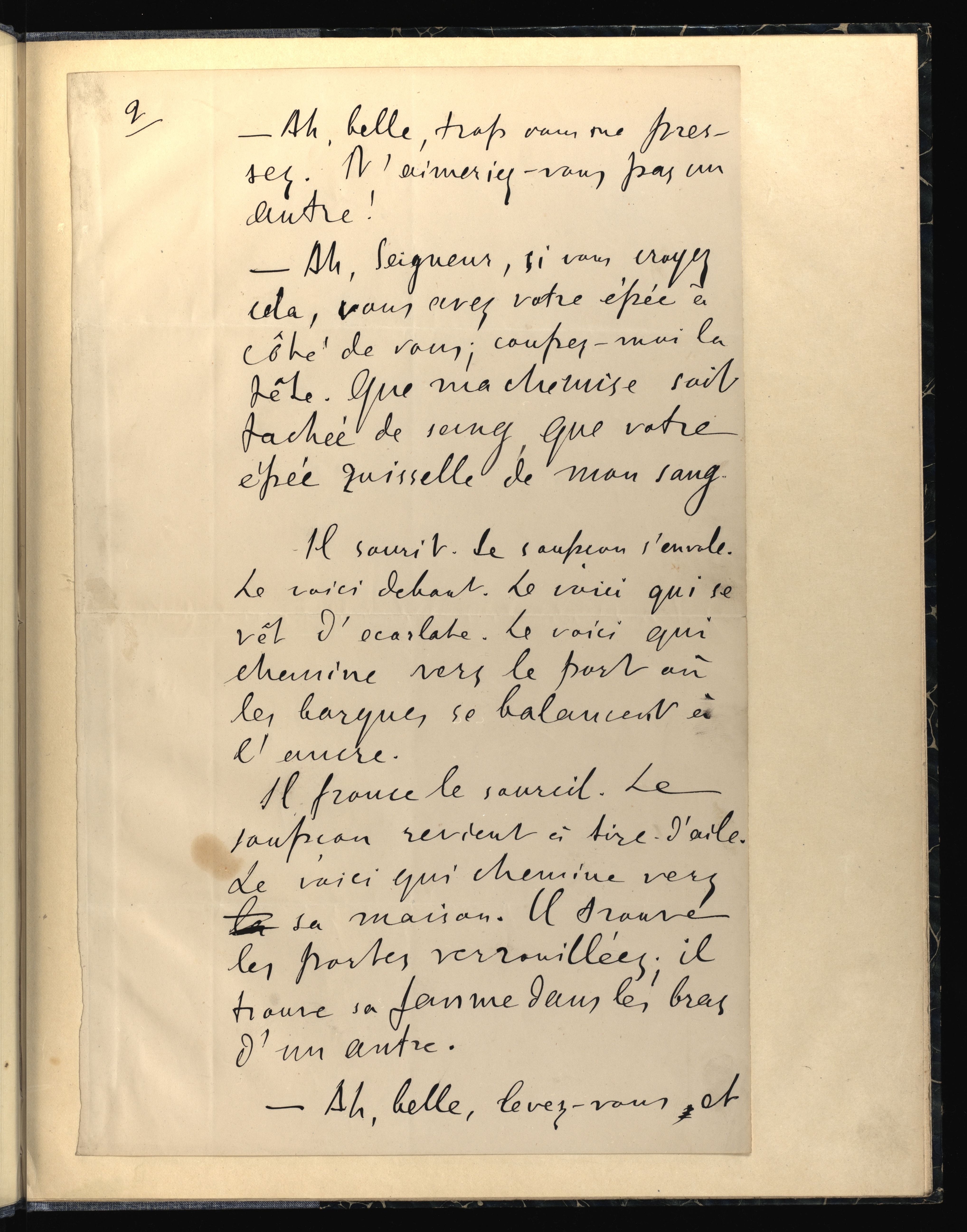 CollationManuscrit autographe signé d'une chanson. 3 feuillets (dimensions inconnues) montés sur onglet dans un volume de feuillets vierges (volume de conservation). Le texte a été écrit à l'encre noire sur le recto uniquement. Ratures et corrections autographes, peu nombreuses. Numérotation des pages par l'auteur à l'angle supérieur gauche (excepté au fol. 1). Marque sèche d'une marge et traces de pliures médianes. Au fol. 1r.: titre centré "Xanthe". Au fol. 3r.: pleine signature. Au recto de la page de garde du volume de conservation, à l'encre rouge foncée, "Jean Moréas: Xanthe / Mcpt. Aut. s." (main de Stefan Zweig) et à l'angle supérieur gauche, au crayon gris "114" d'une main inconnu. Sur la deuxième de couverture, en haut à gauche, le chiffre 126, inscrit au crayon de papier, de la main du libraire Heinrich Hinterberger, correspond au numéro de ce ms. dans la liste tapuscrite envoyée par Stefan Zweig à Martin Bodmer, à l'occasion de la vente de sa collection.