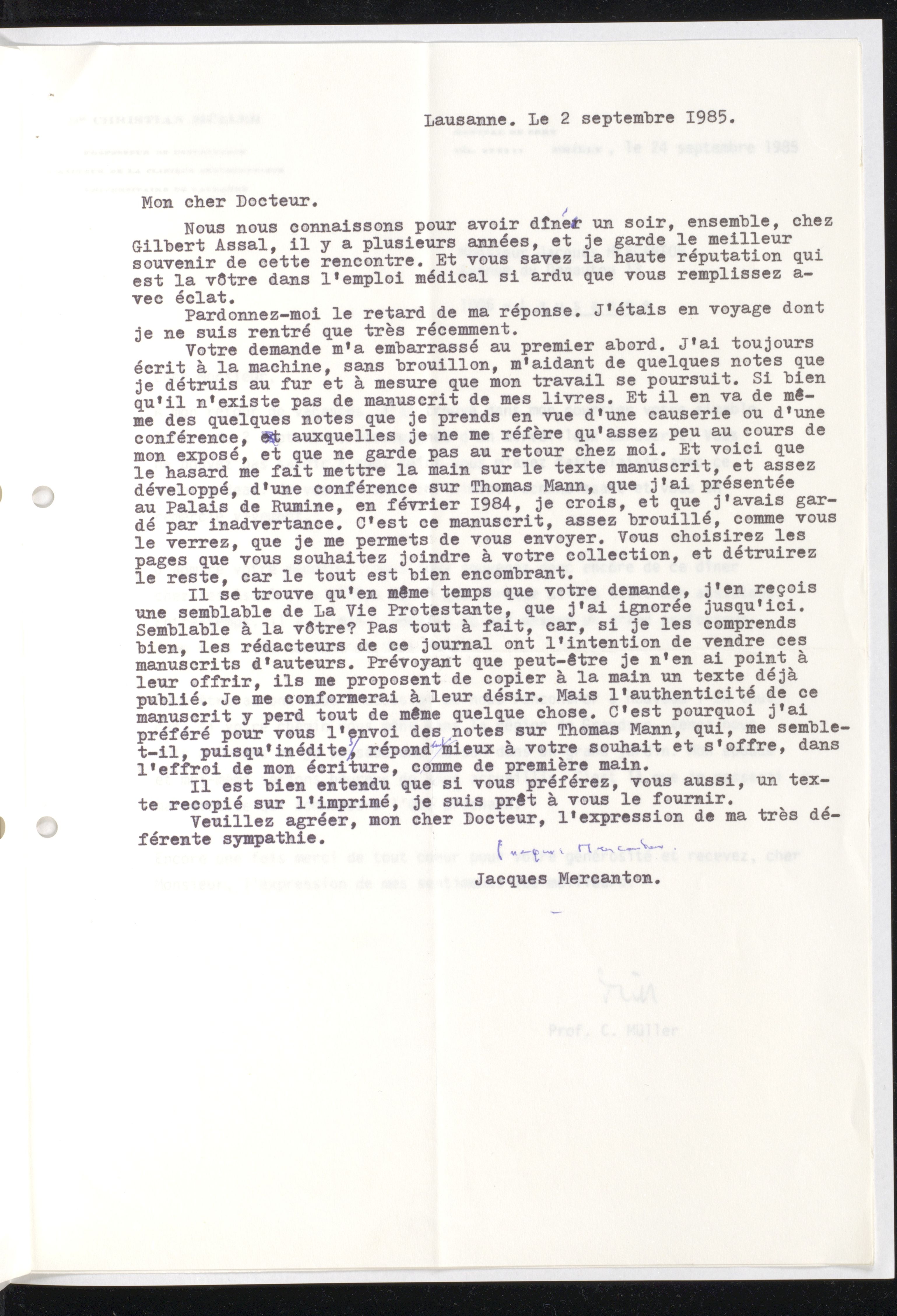 [brouillon d’une conférence sur Thomas Mann + pièces de sa correspondance]