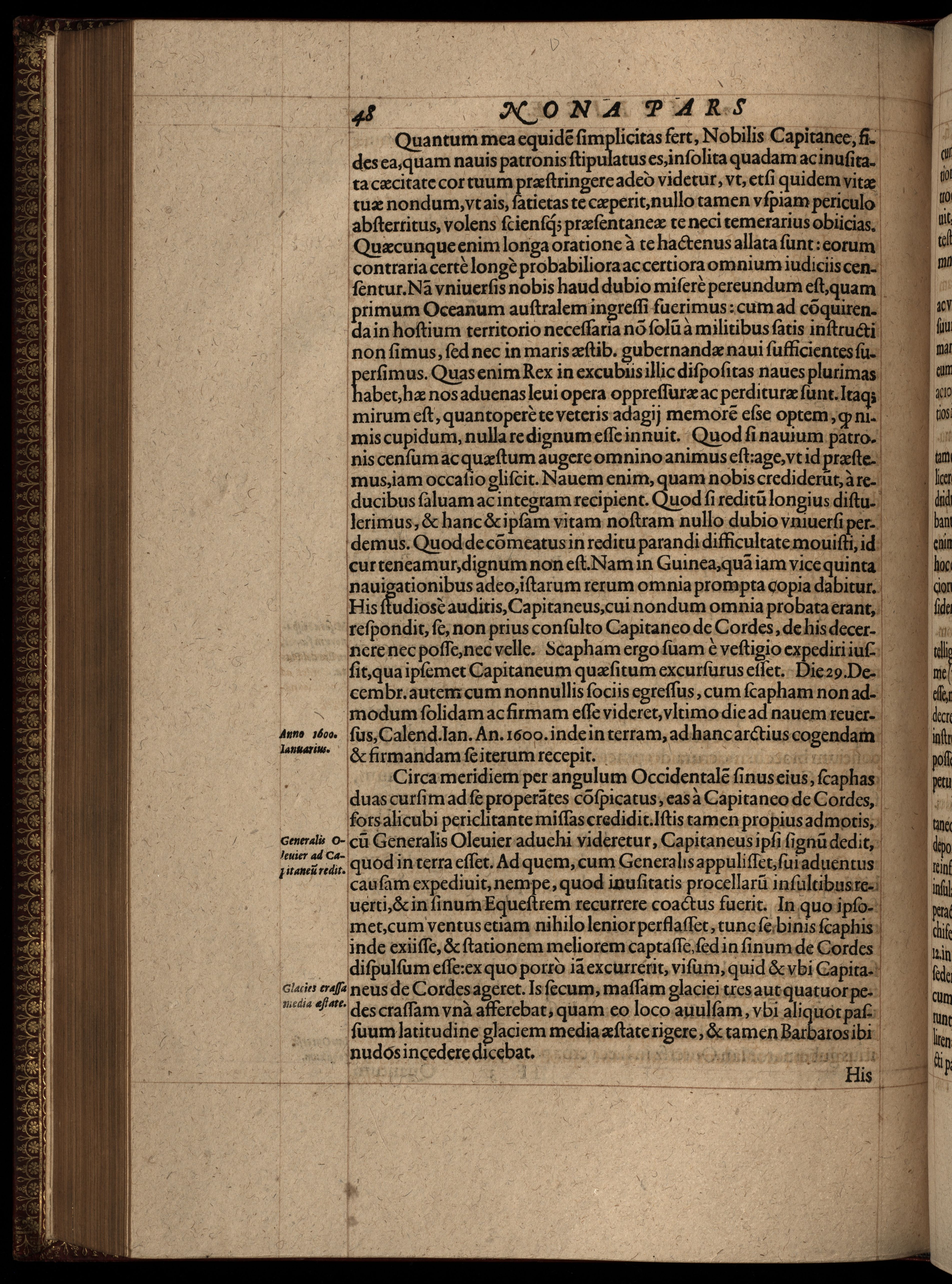 Titre: Relatio historica, siue vera et genuina consignatio ac descriptio illius navigationis, quam v. naves, mense iunio anno 1598. Amstelredamo Solventes, fretum Magellanicum in Moluccanas insulas transmittendi instituto susceperunt : quid nimirum ipsis vsque ad 7. Septembr. ann[o] 1599. acciderit, quo tempore frementium tempestatum ac procellarum vi dissipatis his nauibus, duo capitanei Sebalt de Weert, & Balthasar de Cordes, cum binis tantum nauibus, soli iuncti manserunt.