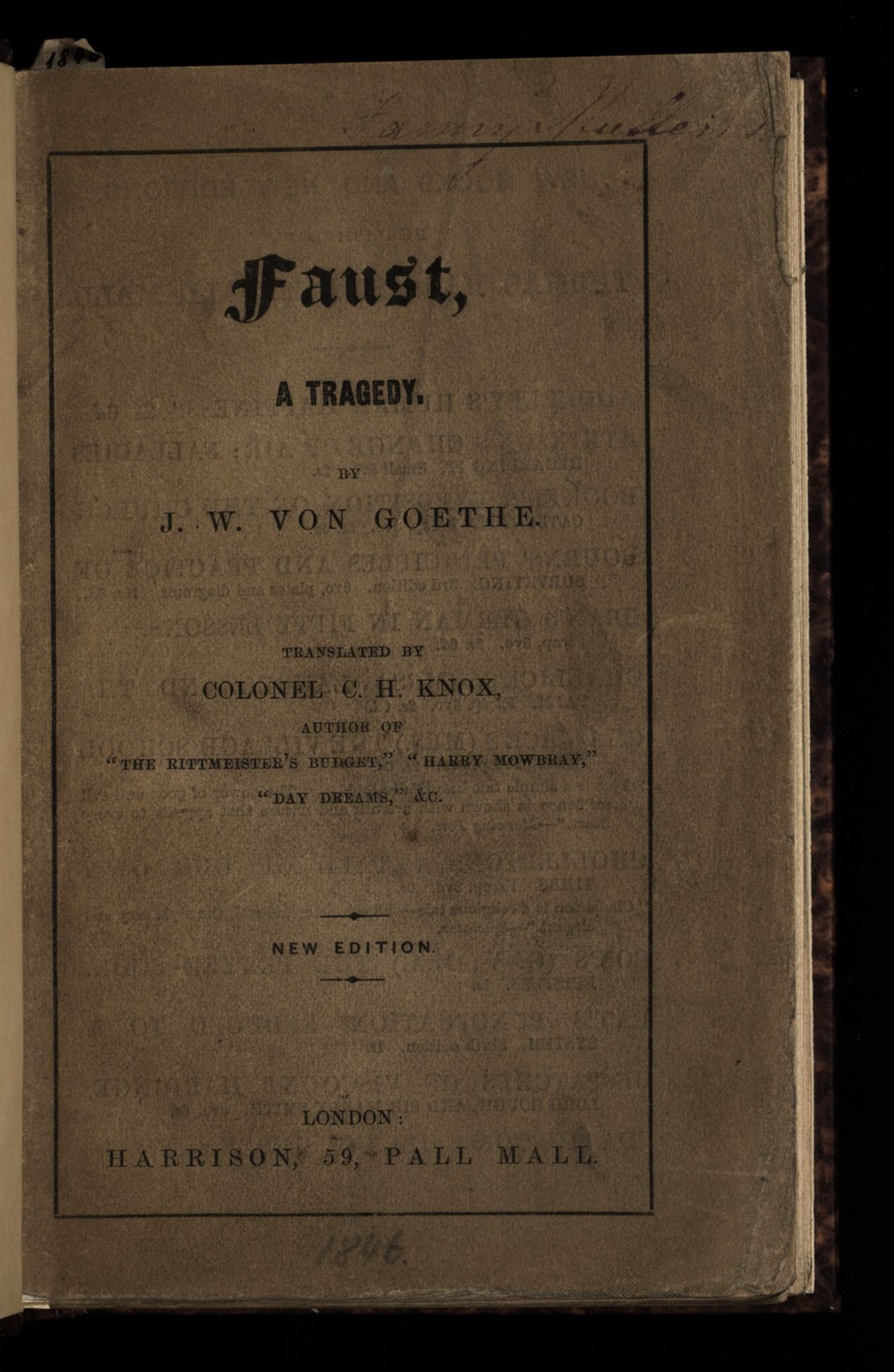 Faust, a tragedy, by J. W. von Goethe. Translated by Colonel C.H. Knox.