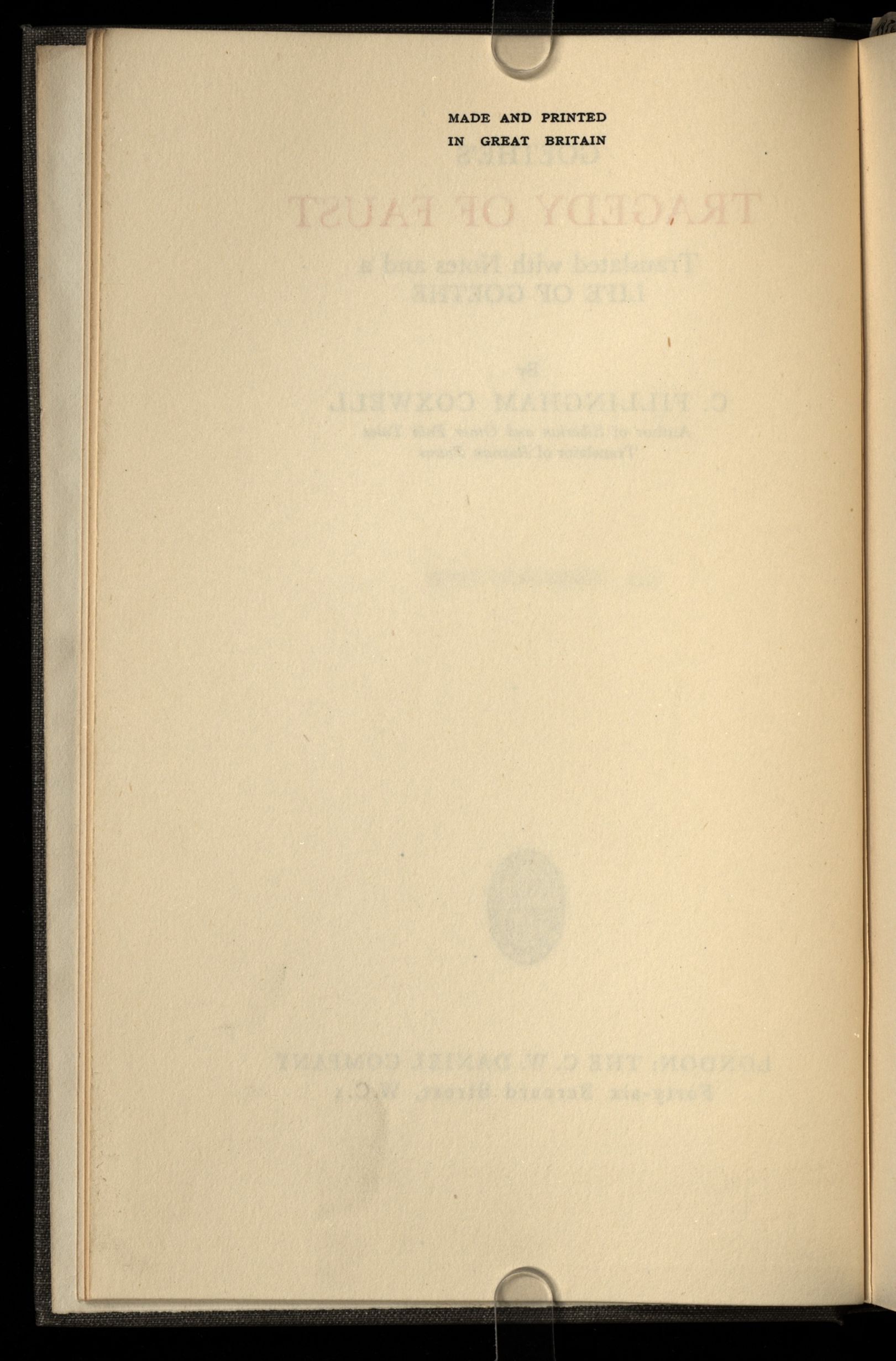 Goethe's tragedy of Faust translated with notes and a life of Goethe by C. Fillingham Coxwell.