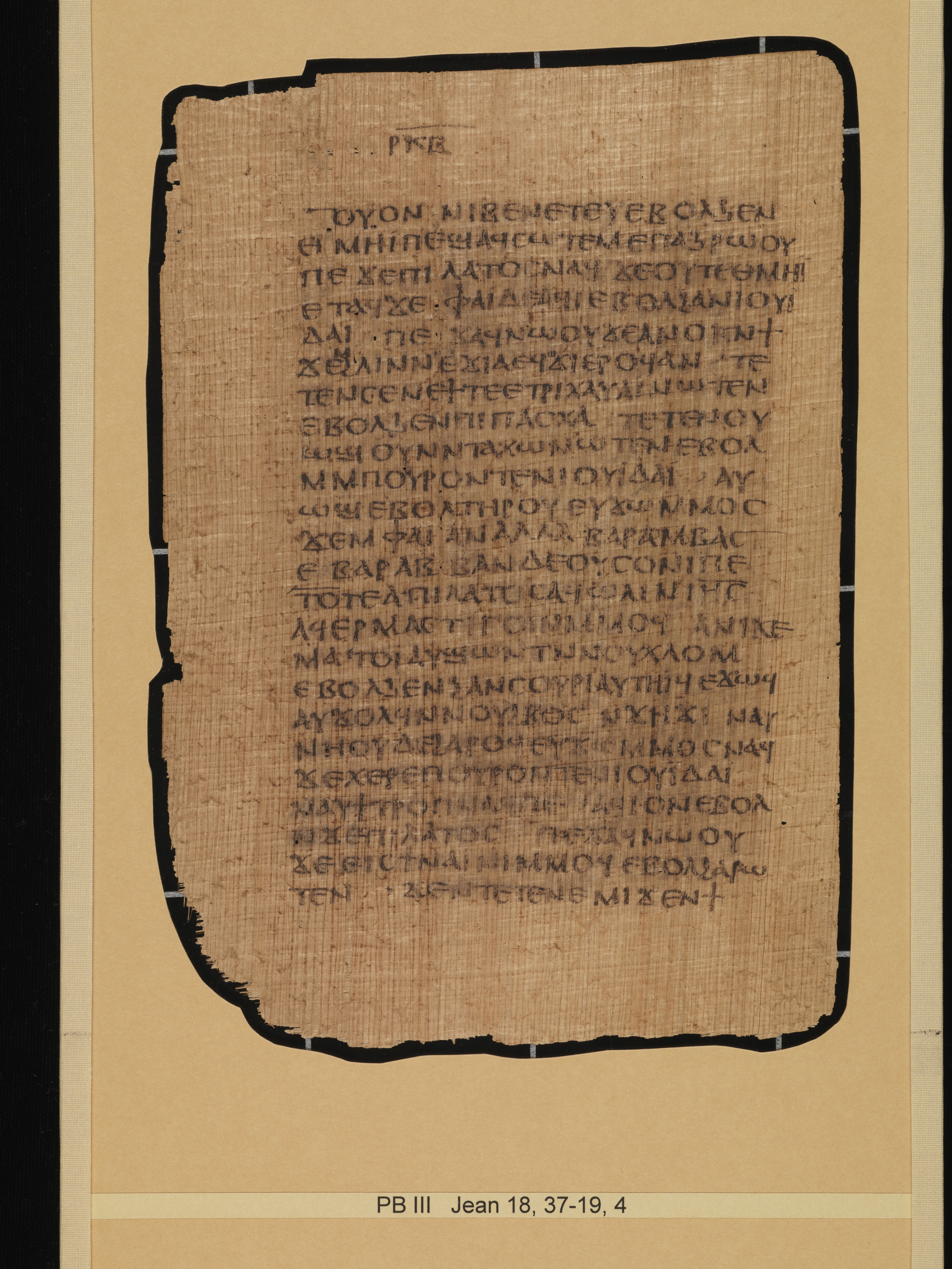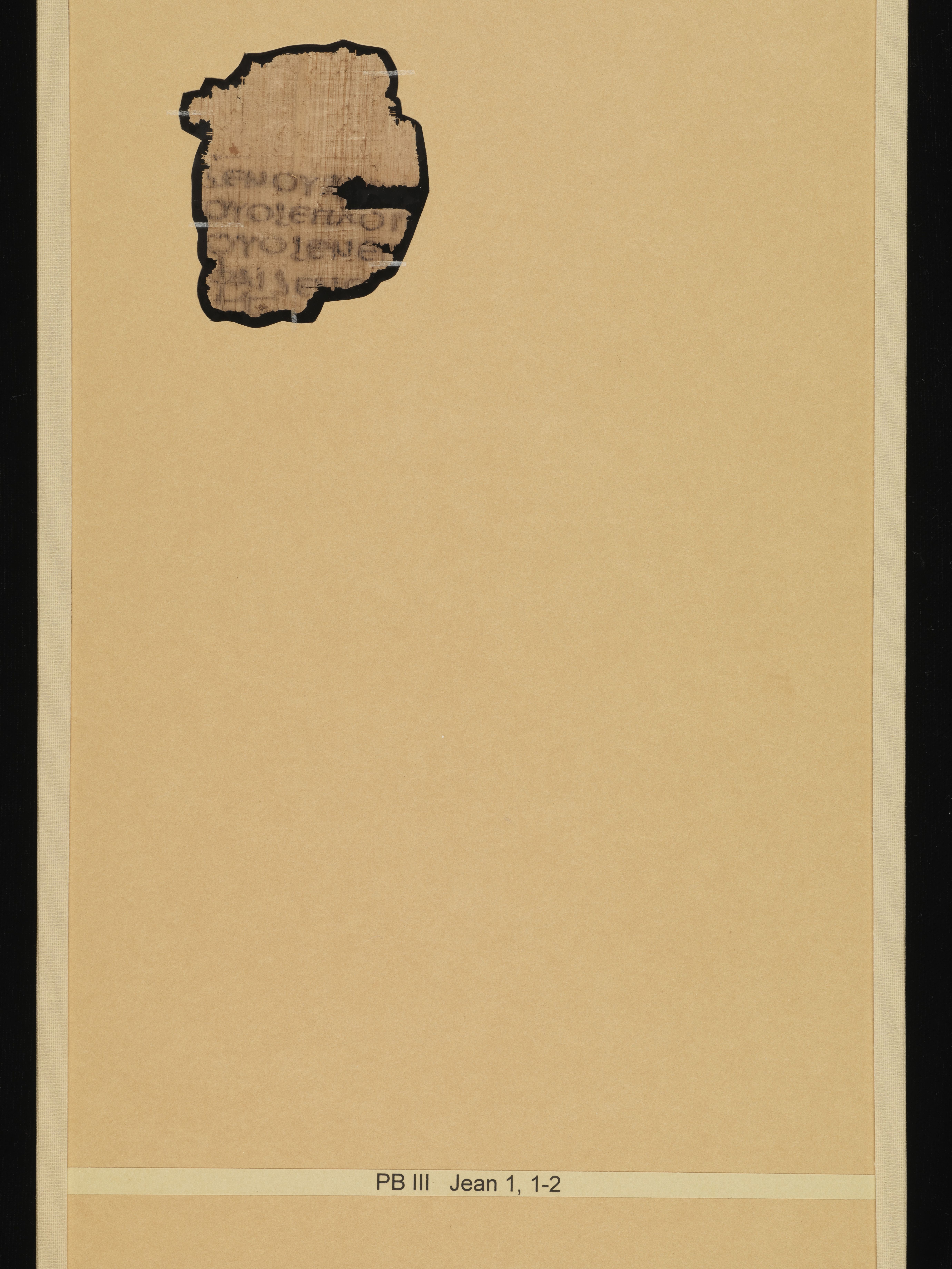 Description: The remains of this codex consist of 72 identifiable papyrus folios and numerous fragments. The original codex would have contained a complete copy of the Gospel According to John and Genesis 1:1-4:2 in proto-Bohairic. The leaves of this codex have been separated and mounted in glass plates. Only the middle leaves of the fourth quire still form a sheet, the other leaves are mounted individually. In addition to the 72 leaves under glass this collection also has three plates of fragments. Most of the first quire is missing with only fragments of the first and last pages of the quire remaining. The Gospel According to John appears first in the codex and ends halfway through a page. The verso of that page is blank. Genesis begins on a new page. The papyrus was partially worn at the time of the original text as evidenced by the way the scribe writes some words around tears in the papyrus (for further description see Sharp, Papyrus Bodmer III, 17). Robinson states that P.Bodmer 3 was brought to Geneva in September of 1955 by Phocion Tano along with P.Bodmer 2 (Robinson, The Story of the Bodmer Papyri, 40-41, 164).